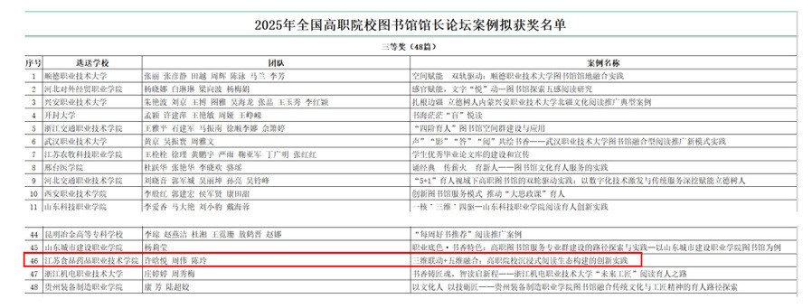 近日,由教育部高等学校图书情报工作指导委员会、高职高专院校分委员会主办的“2025年全国高职高专院校图书馆案例、论文征集评选活动”结果正式揭晓。本次活动吸引了来自全国98所高职院校及行业单位的广泛参与,竞争激烈,共征集到案例139个、论文190篇。经过权威专家的严格评审,我校图书馆许晗悦、周伟、陈玲老师提交的案例作品《三维联动·五维融合高职院校沉浸式阅读生态构建的创新实践》荣获“案例类三等奖”!