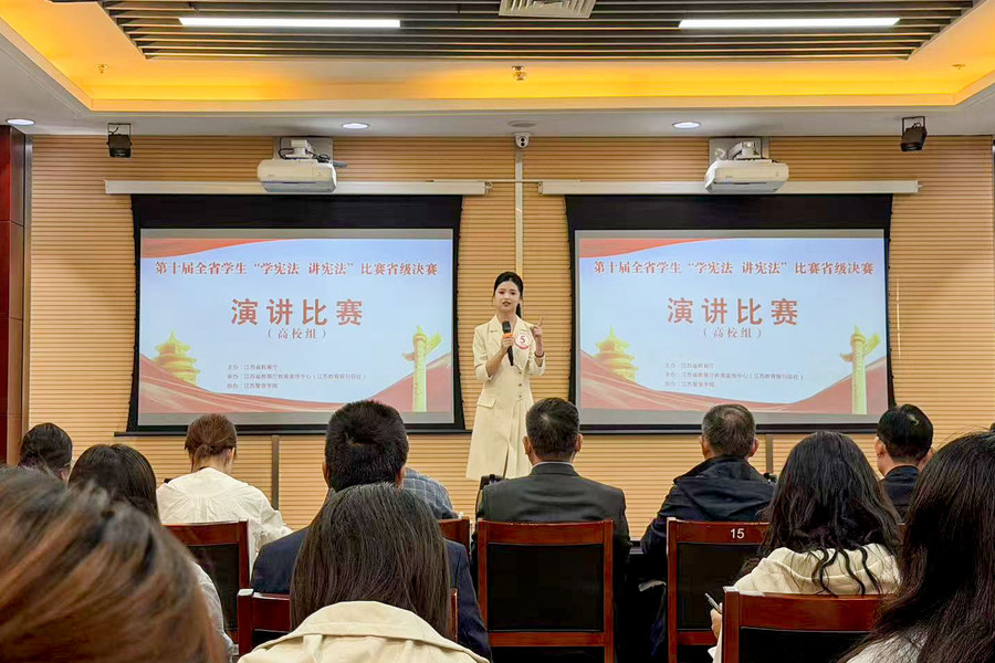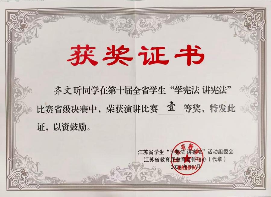 本次比赛由江苏省教育厅统一部署,决赛分为主题演讲与即兴演讲两个环节。在主题演讲环节,齐文昕同学以《以青春之名,赴宪法之约》为题,声情并茂、以思促讲,赢得了评委的一致好评;在即兴演讲环节,她沉着冷静、思路清晰,围绕《中华人民共和国民营经济促进法》中的法律实践以及社会影响力展开深入论述,逻辑严密、语言流畅,充分彰显了我校学子对宪法精神的深刻理解与出色的践行能力。