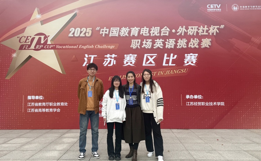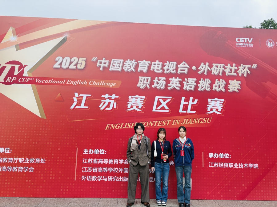 11月8日至9日,2025“外研社杯”职场英语挑战赛江苏赛区比赛在江苏经贸职业技术学院举行。本次赛事涵盖写作、演讲两大竞赛项目,吸引全省71所高校392名选手参与角逐。我校学子张芷韵、胡莯弦、张家锐、常馨怡、王璐瑶在王晓、李莹莹、王婷、李园园四位老师指导下,凭借扎实的英语功底与出色的现场表现,分别在两项比赛中荣获佳绩。