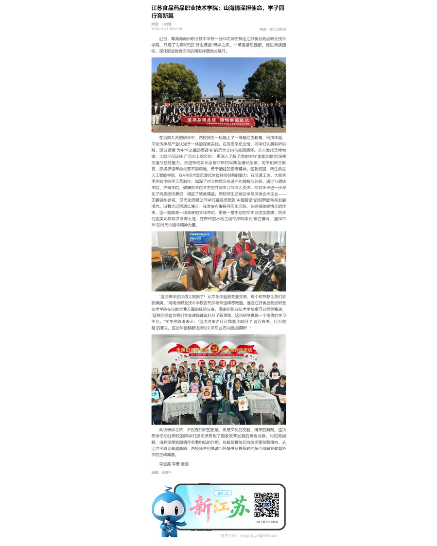 近日,青海海南州职业技术学校一行63名师生抵达江苏食品药品职业技术学院,开启了为期9天的“行走课堂”研学之旅。一场连接东西部、促进民族团结、深化职业教育交流的精彩序章就此展开。
