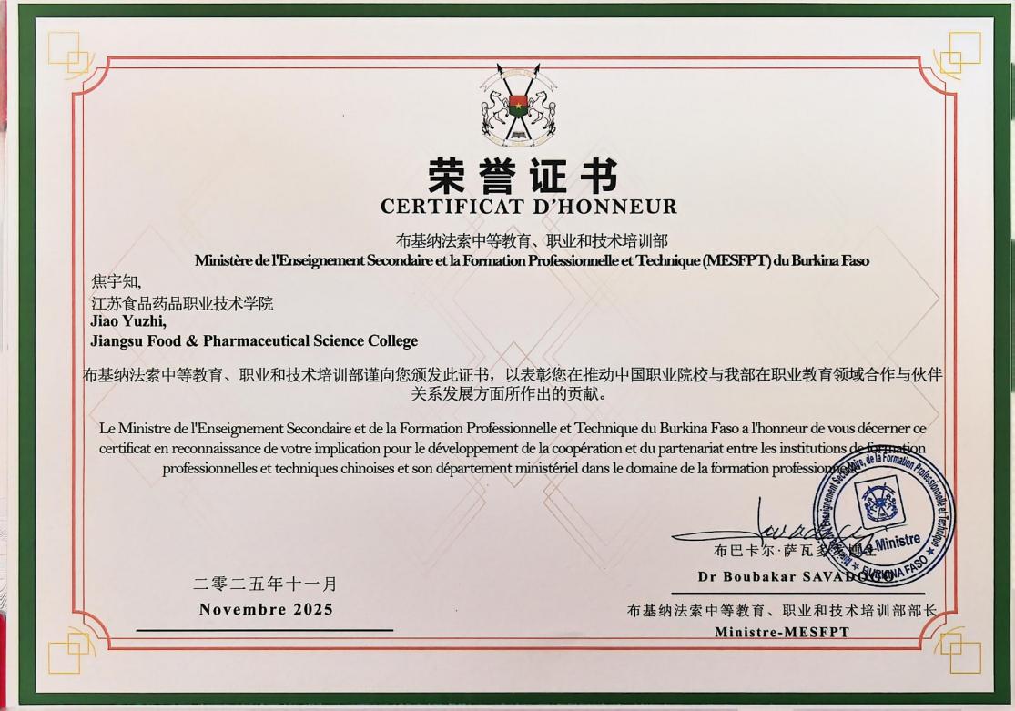2025中非创新合作与发展论坛在武汉东湖国际会议中心举办,我校在会上上获多项表彰。我校《食品检验检测技术》课程标准获摩洛哥职业教育与就业发展办公室(OFPPT)认证,撰写的案例《“标准定向,素养融合,跨境互通”:打造中非“语言+技能”融合职教一体化新范式实践研究》入选中国教育国际交流协会《教育国际交流》期刊“中非教育合作优秀案例”。布基纳法索海外教育部授予我校副校长焦宇知“中非职业教育中国教育合作专家”称号,近年来,学校深耕中非职业教育合作,输出中国教学资源和标准,未来,学校将继续深化与非洲院校及企业的合作。