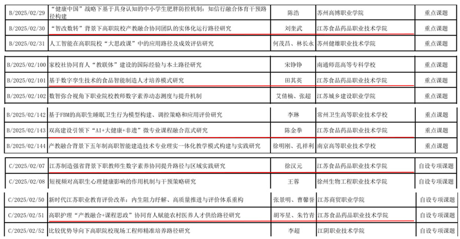 近日,江苏省教育科学规划领导小组办公室公布了2025年度省教育科学规划课题立项名单,我校获批3项高职重点课题和2项高校青年专项课题。重点课题分别是刘奎武老师申报的《“智改数转”背景下高职产教融合协同团队实体化路径研究》、田其英老师申报的《基于数字孪生技术的食品智能制造人才培养模式研究》,陈金拳老师申报的《双高建设引领下“AI+大健康+非遗”微专业课程融合范式研究》,青年课题分别是胡岑星老师申报的《乡村振兴战略下高职护理专业“产教融合+课程思政”协同赋能农村医养服务体系建设路径研究》、徐汉元老师申报的《江苏制造强省背景下职教师生数字素养协同提升路径与区域实践研究》