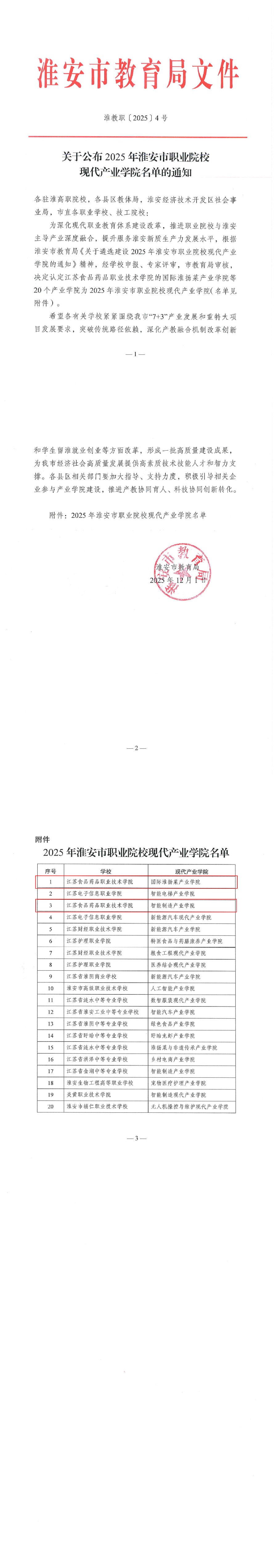 近日,淮安市教育局发布了《关于公布2025年淮安市职业院校现代产业学院名单的通知》(淮教职〔2025〕4号),我校申报的国际淮扬菜产业学院与智能制造产业学院经严格评审,成功入选2025年淮安市职业院校现代产业学院名单。这是我校在深化产教融合、服务地方产业发展方面取得的又一重要成果。