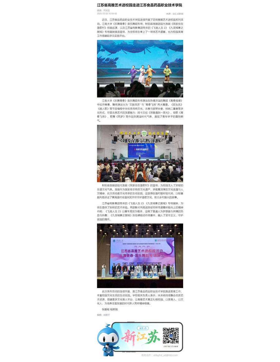近日,江苏食品药品职业技术学院连续开展了四场高雅艺术进校园系列活动。江南大学《乐舞青春》音乐舞蹈专场、射阳县淮剧团现代淮剧《我家住在渔歌村》戏曲巡演,以及江苏省电影集团带来的《飞驰人生2》《九龙城寨之围城》专场展映接连登场,为全校师生奉上了一场场艺术盛宴,也为校园美育工作搭建起多元实践平台。