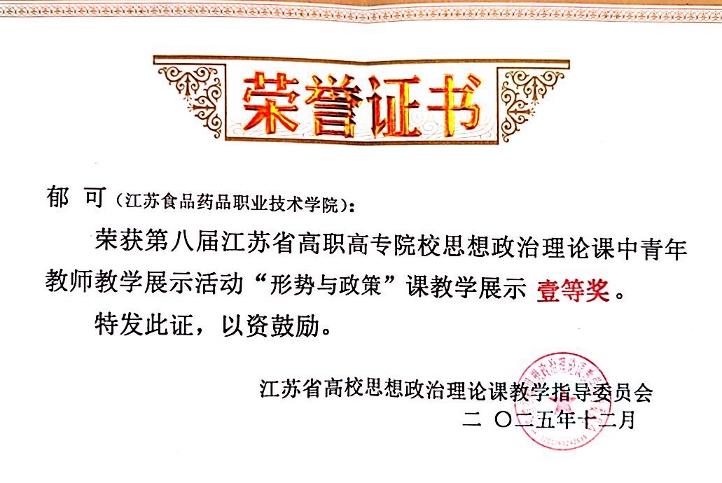 近日,第八届江苏省高职高专院校思想政治理论课中青年教师教学展示活动圆满结束。我校马克思主义学院教师郁可、陈天驰凭借出色表现,分别荣获《形势与政策》课程组一等奖与《习近平新时代中国特色社会主义思想概论》课程组一等奖。