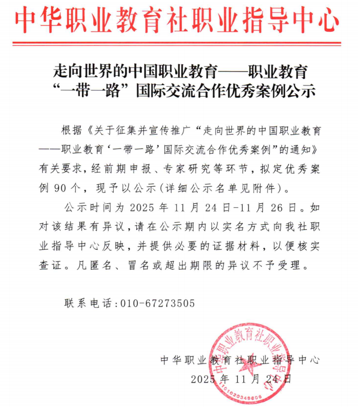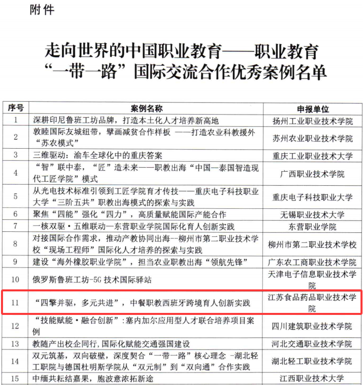近日,中华职业教育社正式公布“走向世界的中国职业教育——‘一带一路’职业教育国际交流合作优秀案例”遴选结果。我校申报的“‘四擎并驱,多元共进’,中餐职教西班牙跨境育人创新实践”案例在全国众多项目中脱颖而出,成功入选全国优秀案例名单。