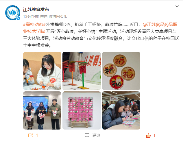#高校动态#斗拱榫卯DIY、掐丝手工杯垫、非遗竹编……近日,@江苏食品药品职业技术学院开展“匠心非遗,美好心情”主题活动。活动现场设置四大竞赛项目与三大体验项目。活动将劳动教育与文化传承深度融合,让文化自信的种子在校园沃土中生根发芽。