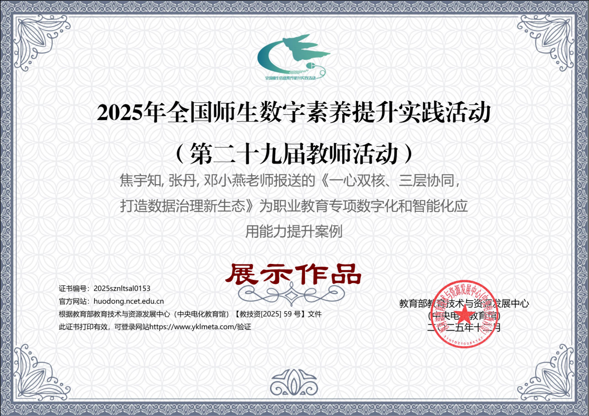 近日,教育部教育技术与资源发展中心正式公布2025年全国师生数字素养提升实践活动(第二十九届教师活动)评选结果。我校报送的《一心双核、三层协同,打造数据治理新生态》案例,在职业教育专项数字化和智能化应用能力提升案例评选中脱颖而出,成功获评展示作品。