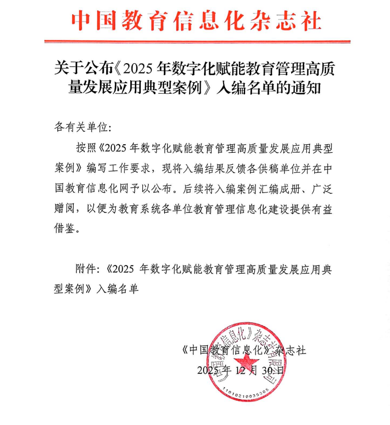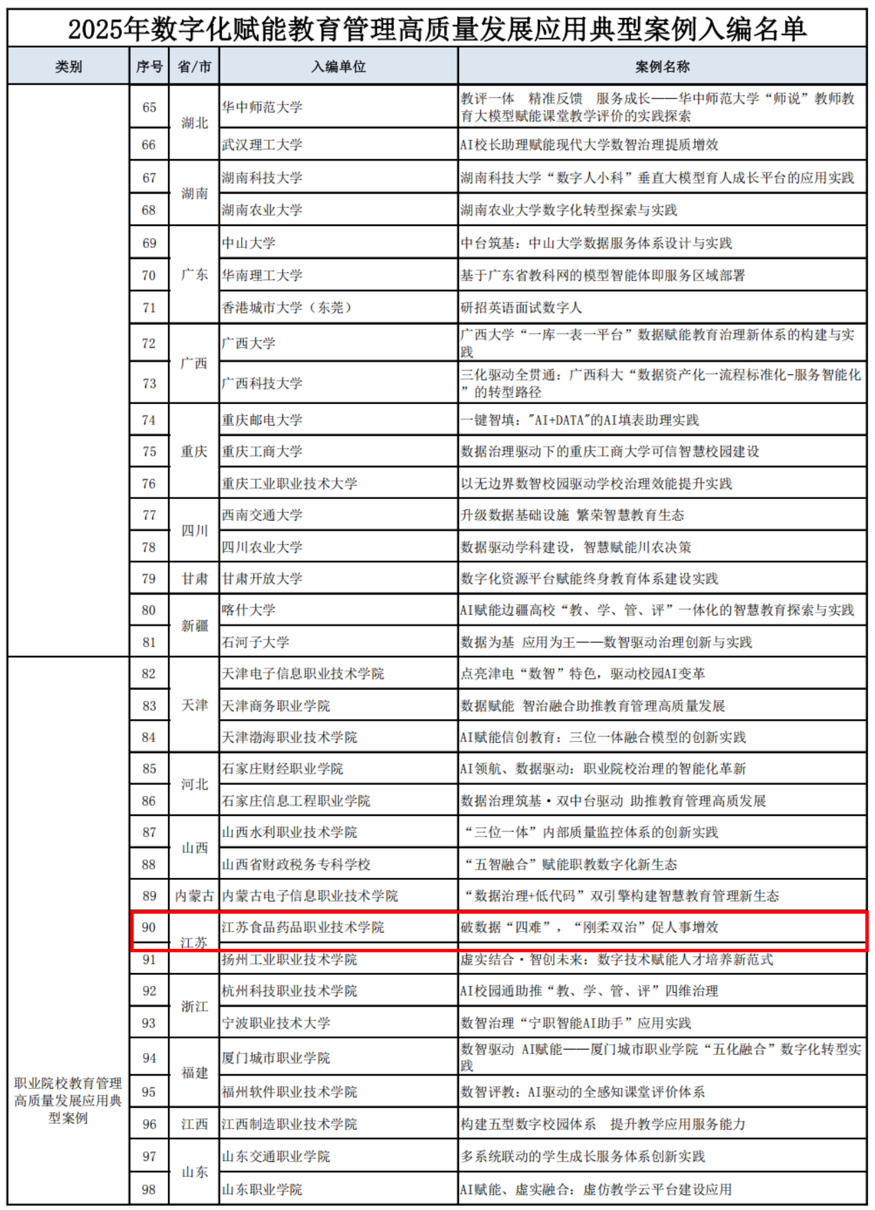 近日,教育部教育管理信息中心主管的中国教育信息化杂志社正式公布《2025年数字化赋能教育管理高质量发展应用典型案例》入编名单。案例经省教育信息化与数据管理中心和教育部教育管理信息中心两次评审遴选,江苏省仅有2所高职院校入选。其中,我校申报的《破数据“四难”,“刚柔双治”促人事增效》案例,经专家评审,成功入选数字化赋能教育管理高质量发展应用典型案例。