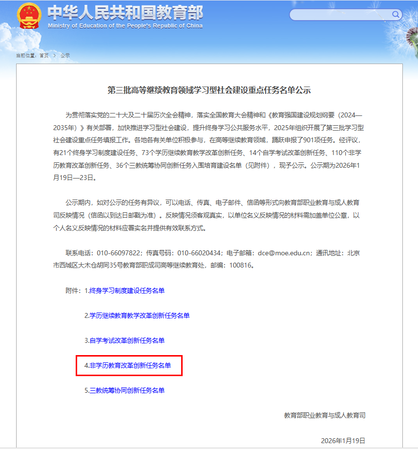 根据《教育强国建设规划纲要(2024—2035年)》有关部署,教育部于2025年组织开展了第三批学习型社会建设重点任务申报工作。全国各单位在高等继续教育领域共申报901项任务,经专家评议,最终254项任务入围培育建设名单,涵盖终身学习制度建设、学历继续教育教学改革、自学考试改革、非学历教育创新及三教统筹协同创新等五类。我校项目位列其中,体现了学校在非学历教育改革创新方面的实践获得认可。
